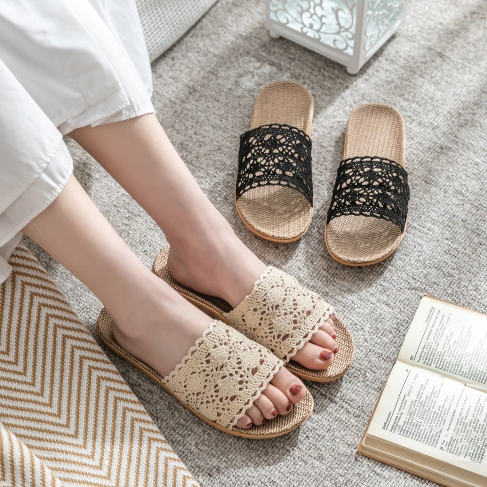 레이스 라탄 왕골 슬리퍼 여름 린넨 여성 거실화 실내화 통기성좋은 발편한 비치 플랫 뮬