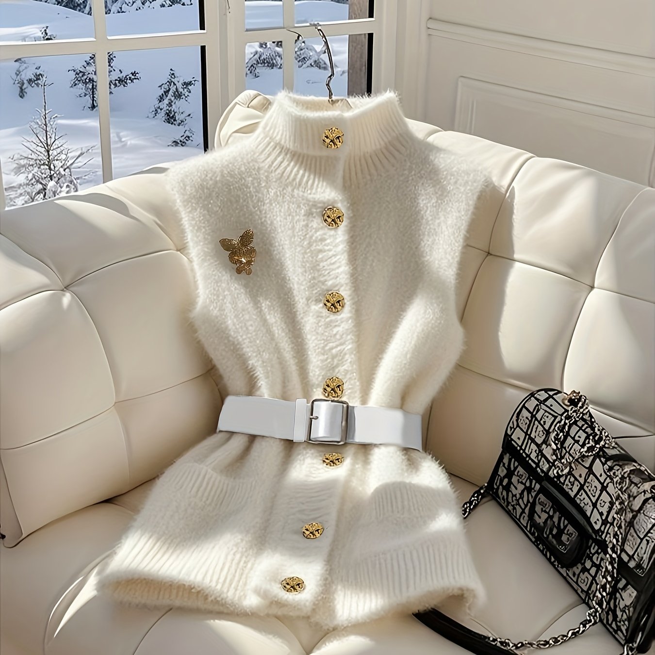 TEMU 여성용 우아한 하이넥 스웨터코트 - 플러시 겨울의 따뜻함, 벨티드 허리라인, 세탁기 사용 가능, 골든톤 버튼 & 페이크퍼 칼라가 돋보이는 레이어링 피스, 캐주얼에서 포멀까지 활용 (솔리드컬러: 화이트/베이지) - 가을과 겨울을 위한 편안한 스웨터원피스, 여성용 웜 니트, 캐주얼 롱슬리브 스웨터, 루즈핏 스웨터, 케이블 디자인 스웨터