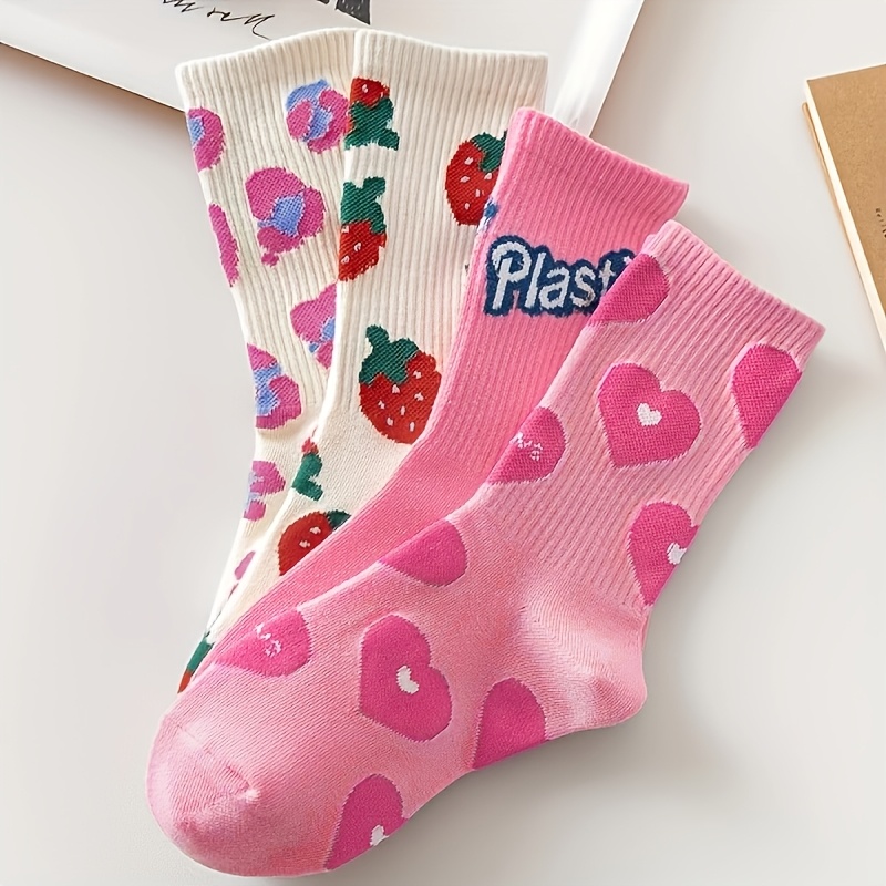 TEMU 4켤레 핑크 스위트 쿨 양말 | 하트 모양 딸기 글자 프린트 종아리 양말, 트렌디하고 패셔너블, 집, 야외, 선물용으로 적합