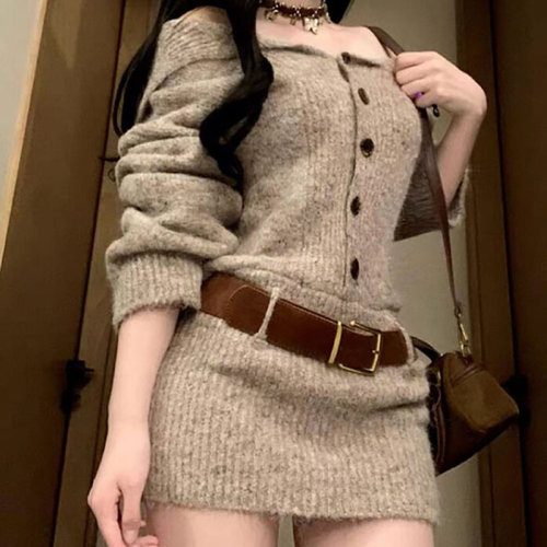 HOTBBA / 원숄더 벨트 단추 니트미니원피스 NF_1005193