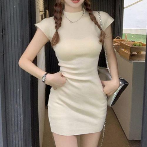 데일리 레이디스 하프넥 캡소매타이트핏 숏 베이직 미니드레스