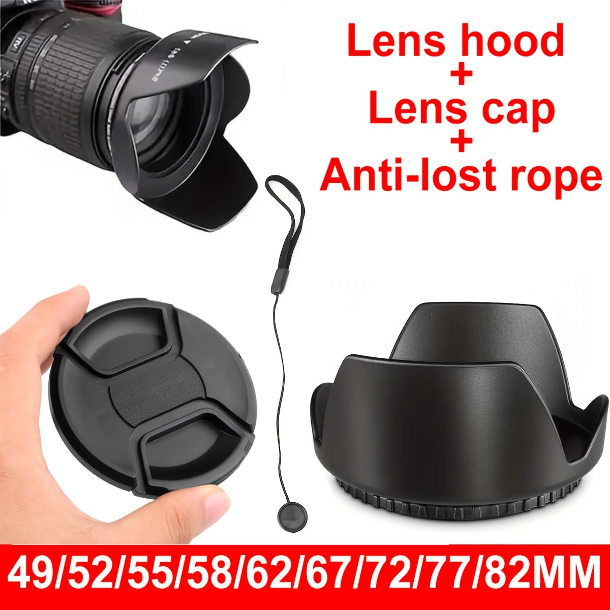 TEMU 튤립 플라워 렌즈 후드 세트 + 렌즈 캡 + 분실 방지 끈 - 캐논, 니콘, 소니 카메라 호환 - 49mm/52mm/55mm/58mm/62mm/67mm/72mm/77mm/82mm - 보호용 렌즈 캡, 컴팩트 디자인,고품질 플라스틱,여행 사진작가,전문 사진작가