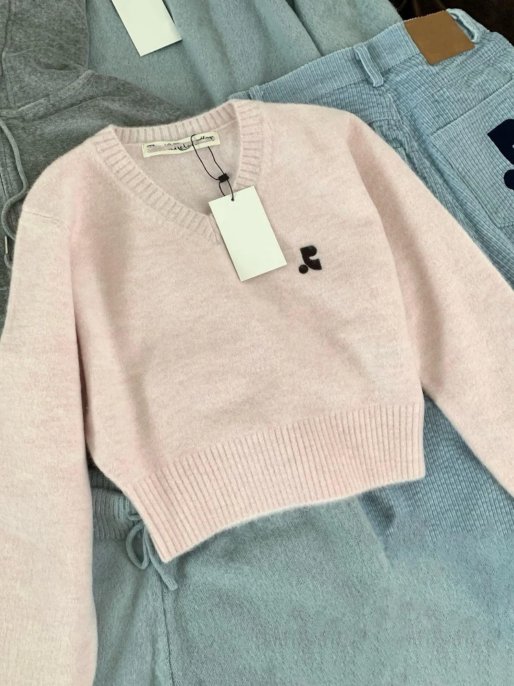 안티에이징 V넥 니트 스웨터 숏 스타일 긴팔 여성 가을 겨울 신상 패션 브랜드 실크 탑 슬림핏 스타일