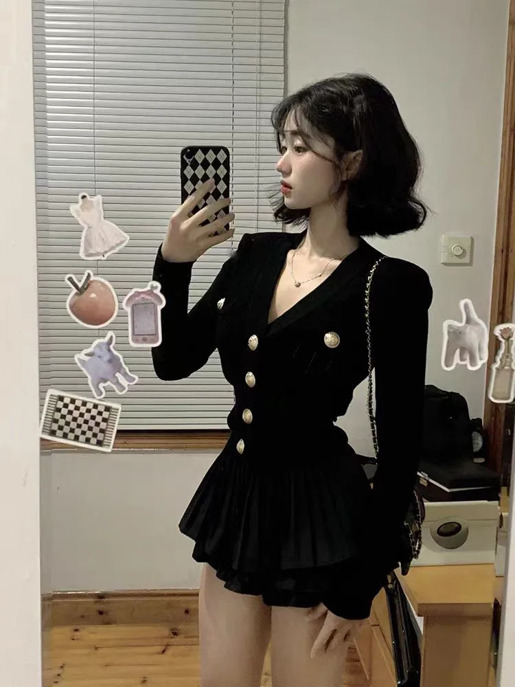 봄 여름 니트 니트 스커트 세트 여성 패션 부팡 플리츠 하프 길이 투피스 세트 우아하고 시크한 스타일 폴리에스터 섬유 긴 소매 V넥 버튼 클로저