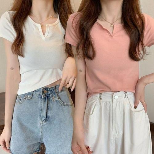 하프 하이 칼라 반팔 티셔츠, 한국 투명, 슬림핏, 신축성 있는 단색 이너, 섹시한 큰 가슴 티셔츠