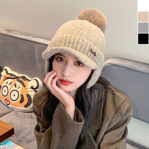[에이치플러스몰]러블리 레빗퍼 방울 창 스마일 이어캡 방울비니 모자