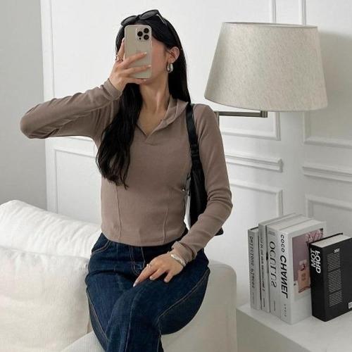 [신상오픈런]|KHT6A64|이지으 긴팔티 배꼽티 슬림 잔골지 스퀘어넥 매듭 여성_18175276_597559