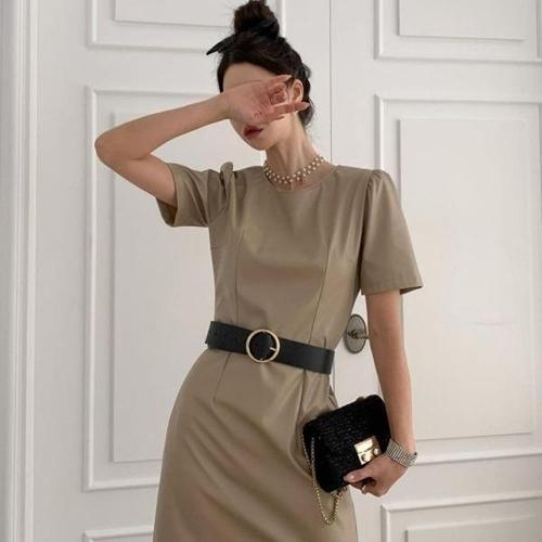 [신상오픈런]므자르 가죽 여성 숏슬리브 미니 주름디테일 원피스 볼륨 일자라인