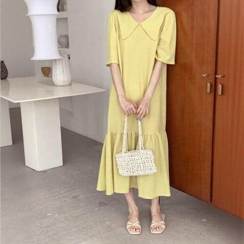 네모엔룩 여성용 모던절개핀턱 여름 A라인 핀턱주름 캡민소매 면 무지 롱 원피스(허리끈 포함)