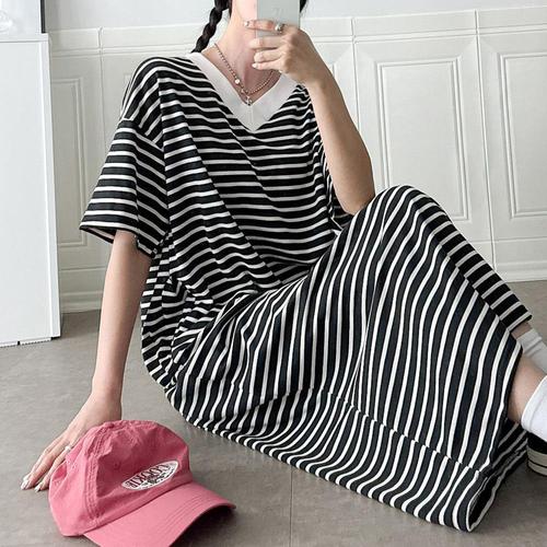 [미라클세븐][M7] 여자 SS 줄무늬 실내복 임산부 브이 롱원피스