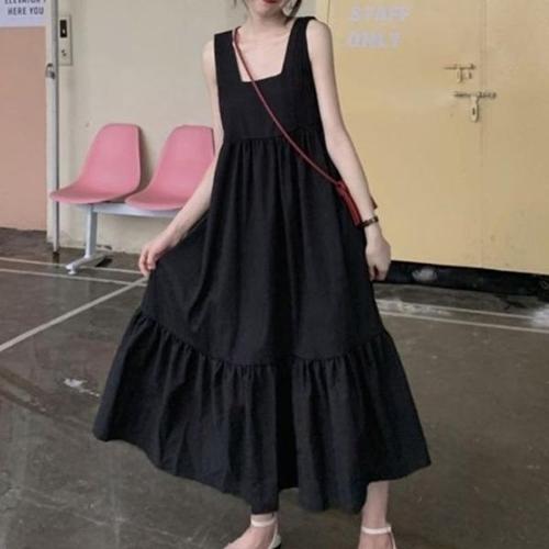 [라일리의류] Rly 주름 포인트 캉캉원피스 스퀘어넥 민소매 롱기장