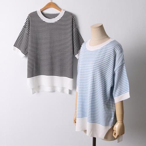 샵앤) 여성 라운드 단가라 잔가로줄 캐주얼 반팔 니트티 DGB-WKN-4729-아이보리