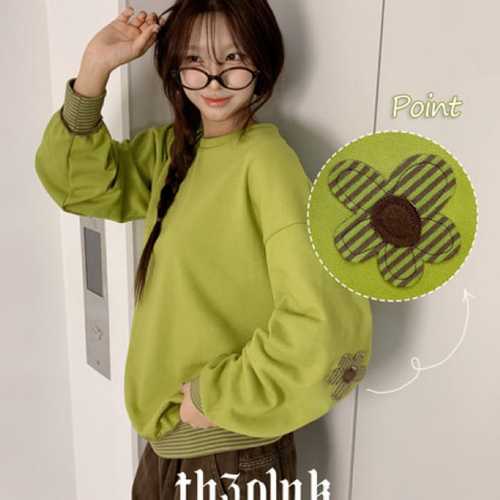 더핑크 / 얼즌 오버핏 플라워 패치 스트라이프 배색 맨투맨