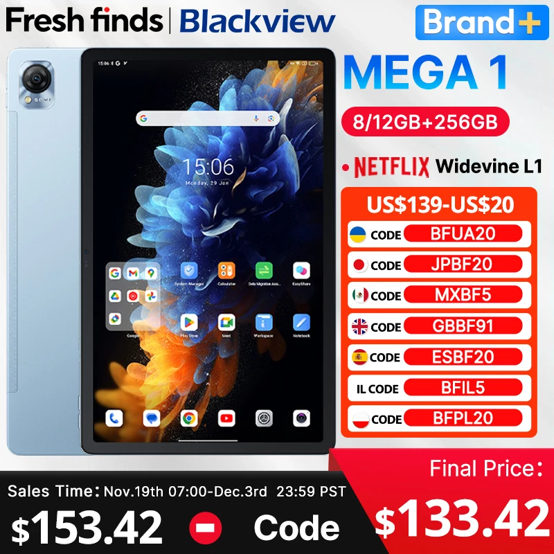 Blackview MEGA 1 태블릿 11.5" 2.4K 120Hz 디스플레이 50MP 카메라 12GB 256GB 8800mAh 33W 충전 Widevine L1 안드로이드 패드 PC