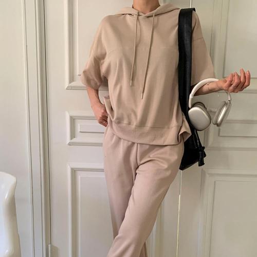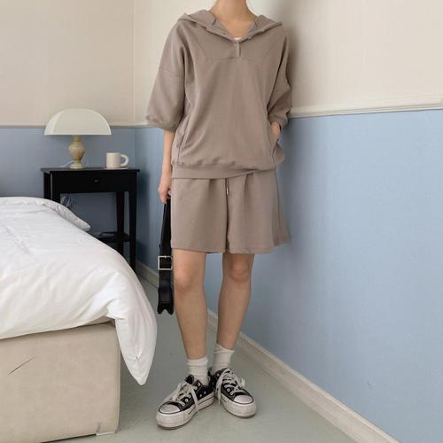 [옷자락]여자 절개 후드 반팔 밴딩 반바지 세트
