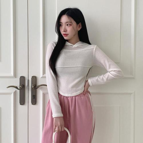 니트 카라 골지 사선 절개 긴팔 슬림핏 데일리 모임룩예쁜 라운드 오버 여성브이넥 배색 후드 후드티 어깨