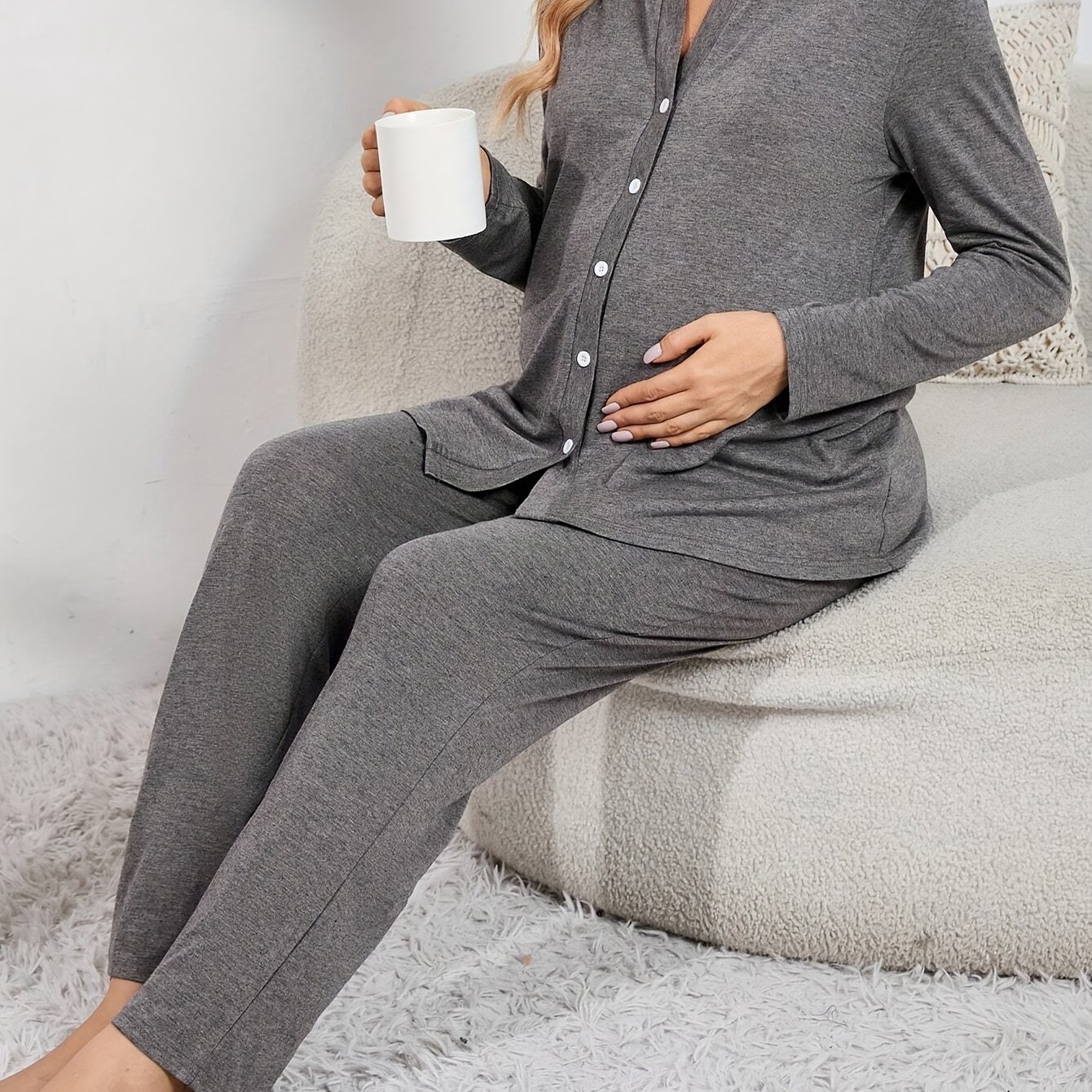 TEMU 임산부용 버튼 V넥 긴팔 긴바지 편안한 파자마 세트|임부복