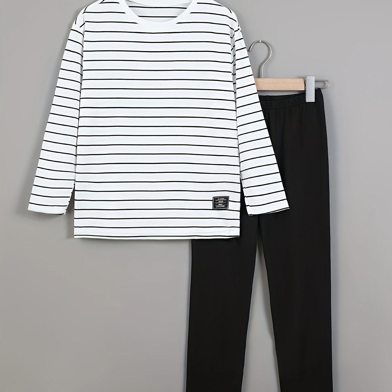 TEMU 여아용 화이트 베이스 블랙 라운드넥 긴팔 상의와 블랙 타이트 레깅스, 캐주얼 기본 스타일, 데일리 멀티-오피케이션 및 야외 활동에 적합