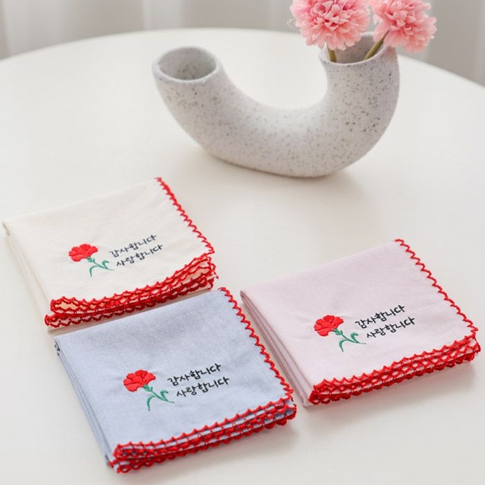 카네이션 자수 스티치 순면 데일리 손수건_감사합니다 3color