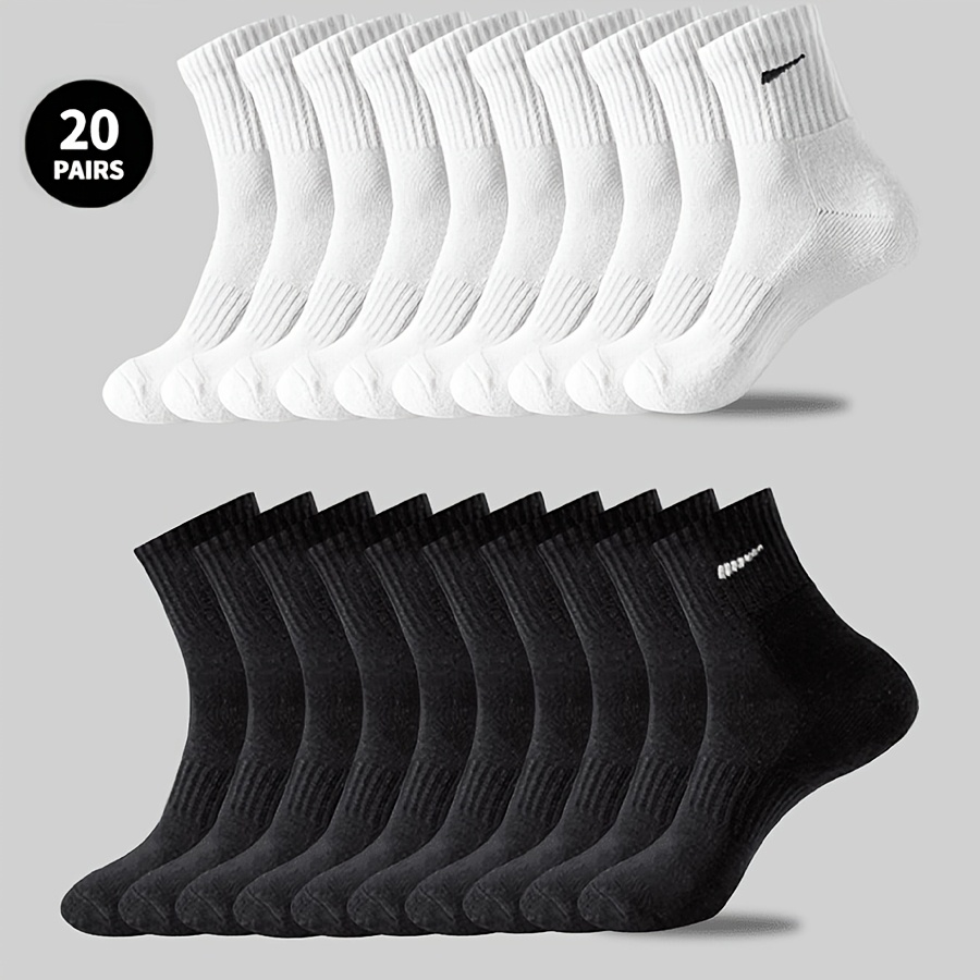 TEMU 여성/남성용 통기성 중목 운동 양말 20켤레, 사계절 일상 및 야외 활동용 흡취 기능 화이트 & 블랙 양말