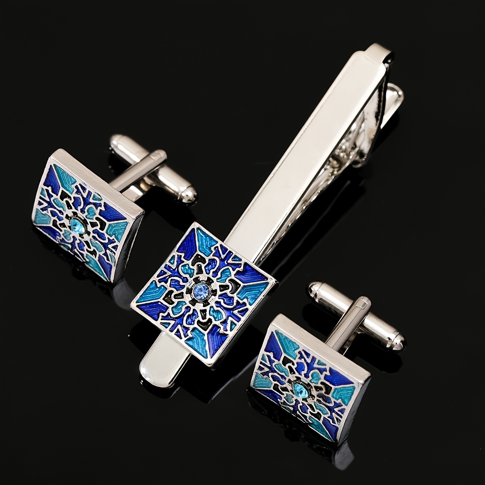 TEMU 3개 남성용 프렌치 셔츠 비즈니스 넥타이 클립 소매 버튼 세트, 빈티지 패턴 블루 & 실버 장식 액세서리, 넥타이 클립, 우아한 스타일, 빈티지 패턴, 내구성 좋은 소재, 버튼 세트, 남성 패션, 남성용 넥타이 클립, 우아한 넥타이 클립, 넥타이핀, 넥타이 딤플클립, 구리 넥타이 클립