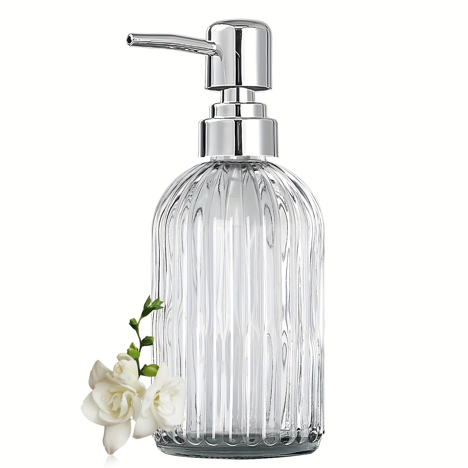 TEMU 400ml 우아한 파란색 유리 로션 디스펜서, 금색 펌프 - 텍스처드 라운드 디자인, 독립형, 욕실 및 주방에 이상적, 재충전 가능한 비누/샴푸/콘디셔너 병, 욕실 액세서리 | 리브드 텍스처 | 투명 병, 비누 디스펜서