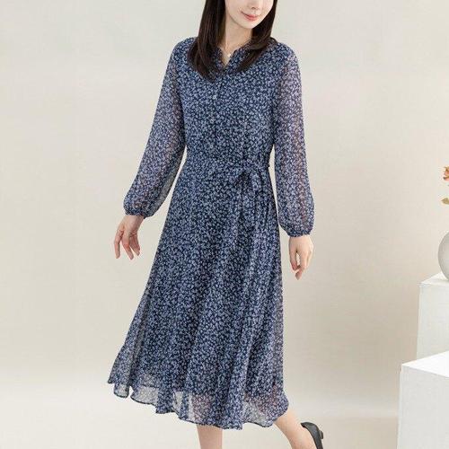[비비진]캐주얼 편안한 중년여성 하객룩 봄 가을 40대 긴팔 허리밴딩 원피스