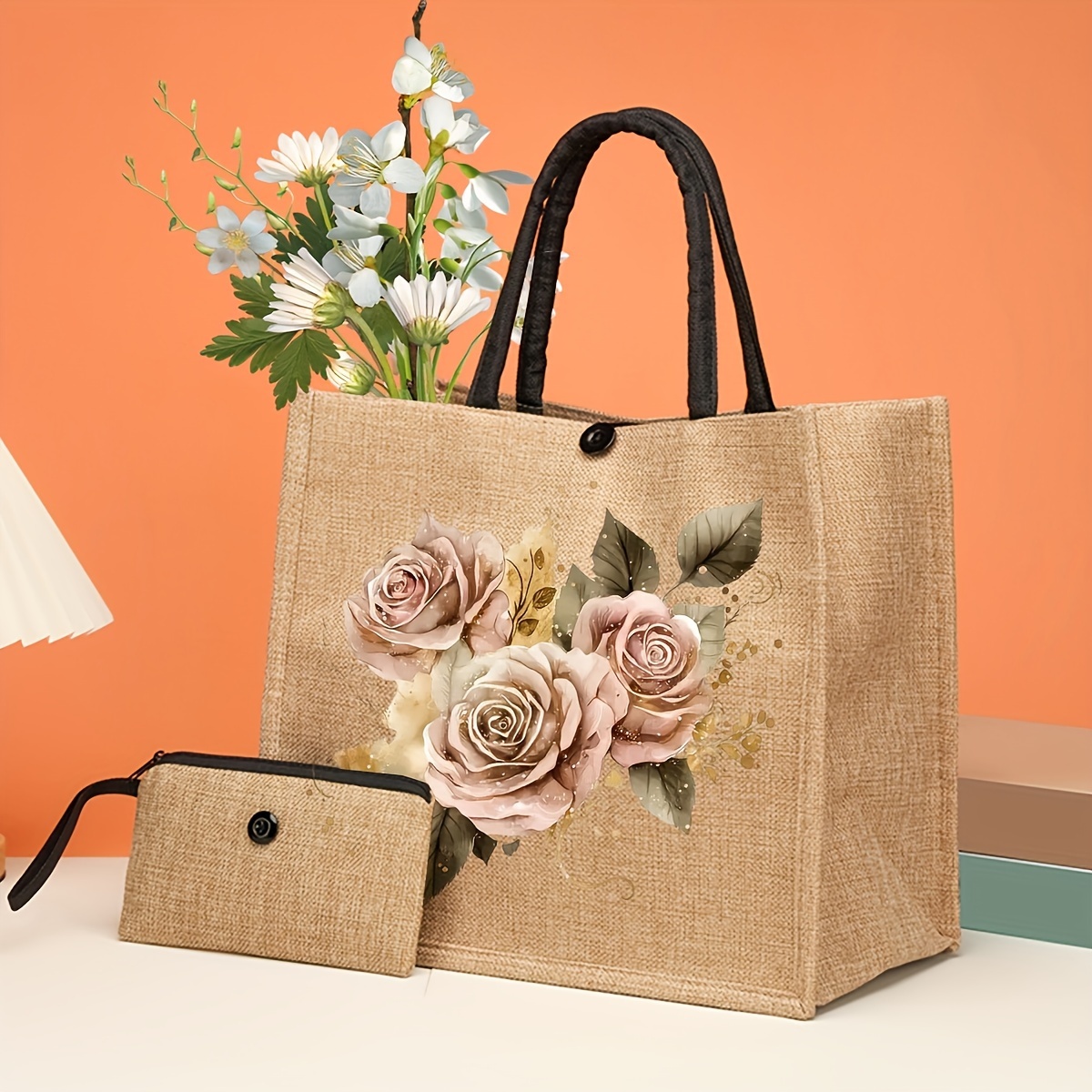 TEMU 2피스 세트, 우아한 꽃과 새 프린트, 가벼운 폴리에스테르 토트 백, 어깨 스트랩, 손 세탁/드라이 클리닝, 화장품 파우치 포함, 스타일리쉬 여성 패션 숄더 백, 여행 비치 백, 오일 에지 없음, 포지션 프린트, 스냅 버튼으로 닫힘, 폴리에스테르 라이닝.