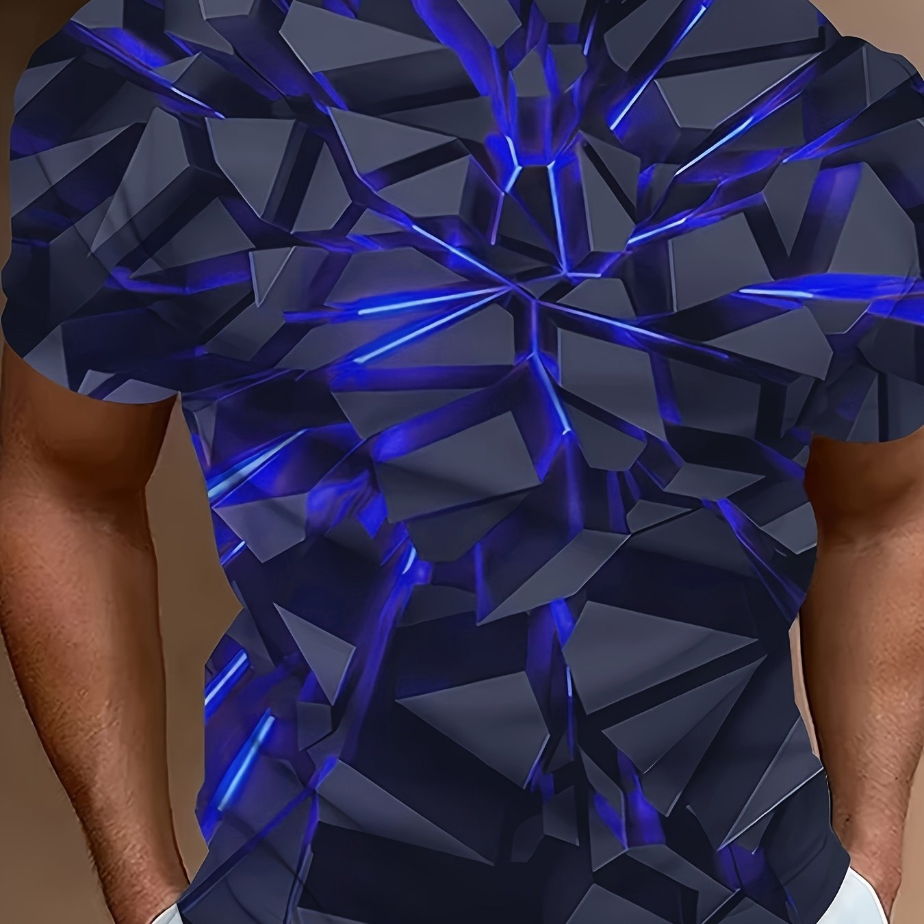 TEMU 남성용 3D 프린트 추상 힙합 그래픽 티셔츠 - 생동감 있는 블루 & 블랙 기하학적 디자인, 반팔, 라운드 넥, 캐주얼 스트리트웨어, 폴리에스터 혼방, 세탁기 사용 가능, 힙합 티셔츠