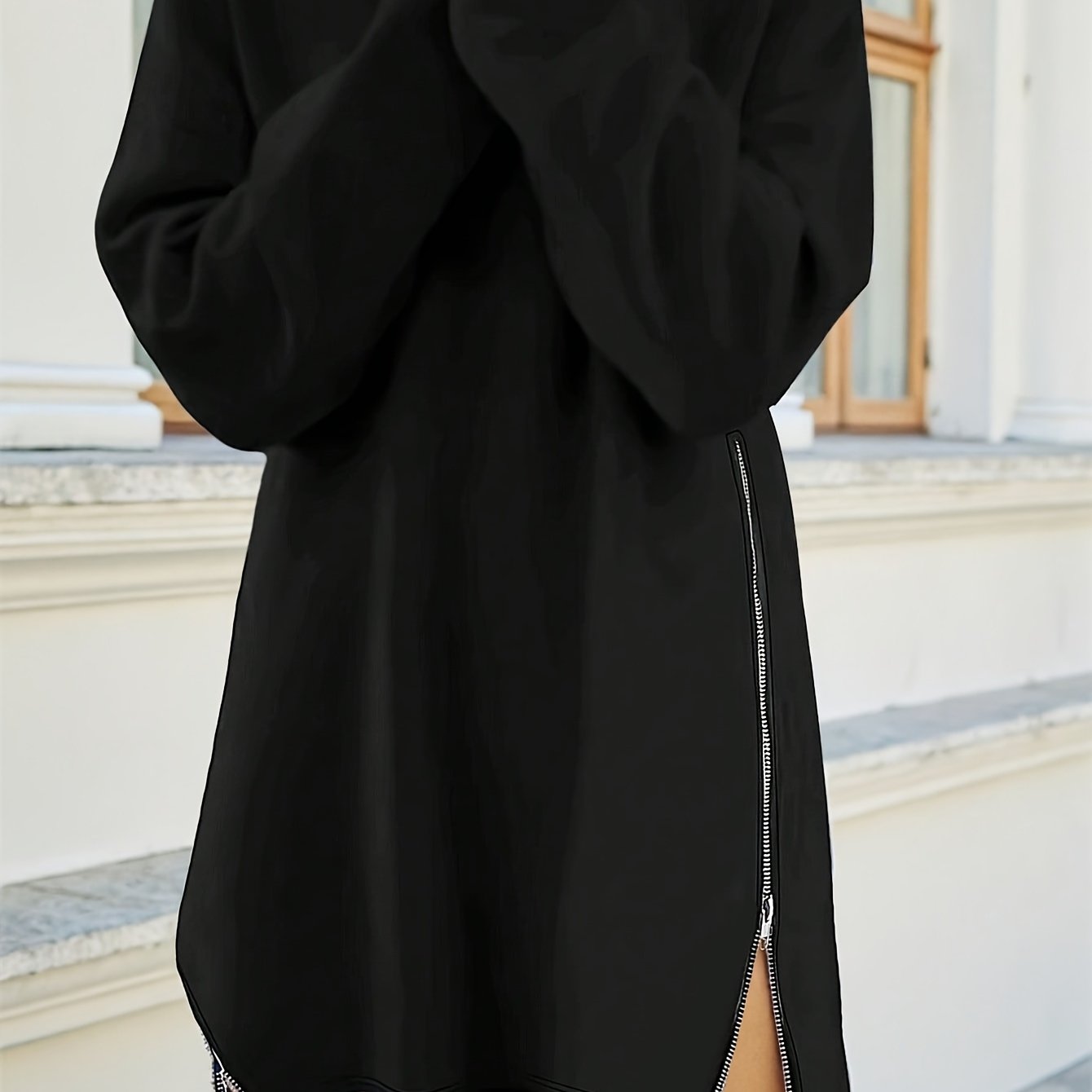 TEMU 우아한 A라인 맥시 드레스, 전면 지퍼 장식 - 겨울용 따뜻한 긴팔 라운드넥 드레스, 캐주얼, 홈웨어 및 세미포멀 착용에 적합 - 솔리드 컬러 쉬운 관리 드레스