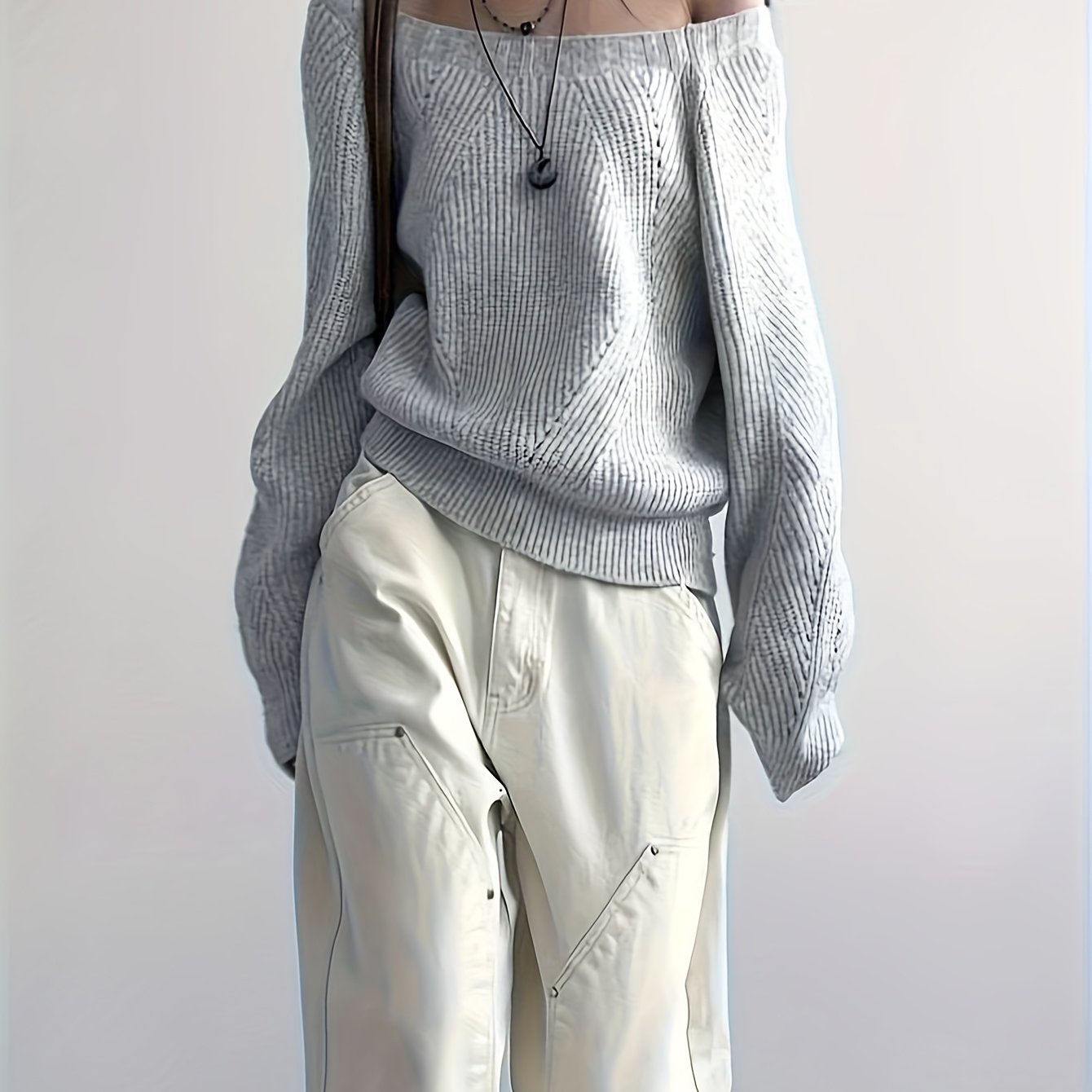 TEMU 여성용 Y2K 한일 스타일 오프숄더 스웨터 - 솔리드 화이트 라운드넥 긴팔 겨울 코트, 일본-한국 스타일 풀오버 자켓, 가을 & 봄용, 기계 세탁 가능한 레이어드 아웃핏 (비침 방지)