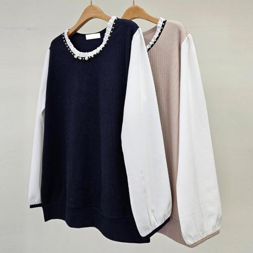 나야홍 / 빅사이즈진주배색티 T789L502 젤리펄프릴넥배색긴팔티