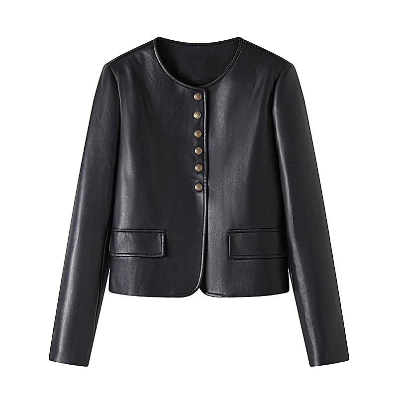 패셔너블한 PU 가죽 숏 재킷 여성용 라운드 넥 싱글 버튼 컬러 시리즈 가을 신상 소형 사이즈 탑 출퇴근 스타일 루즈 핏