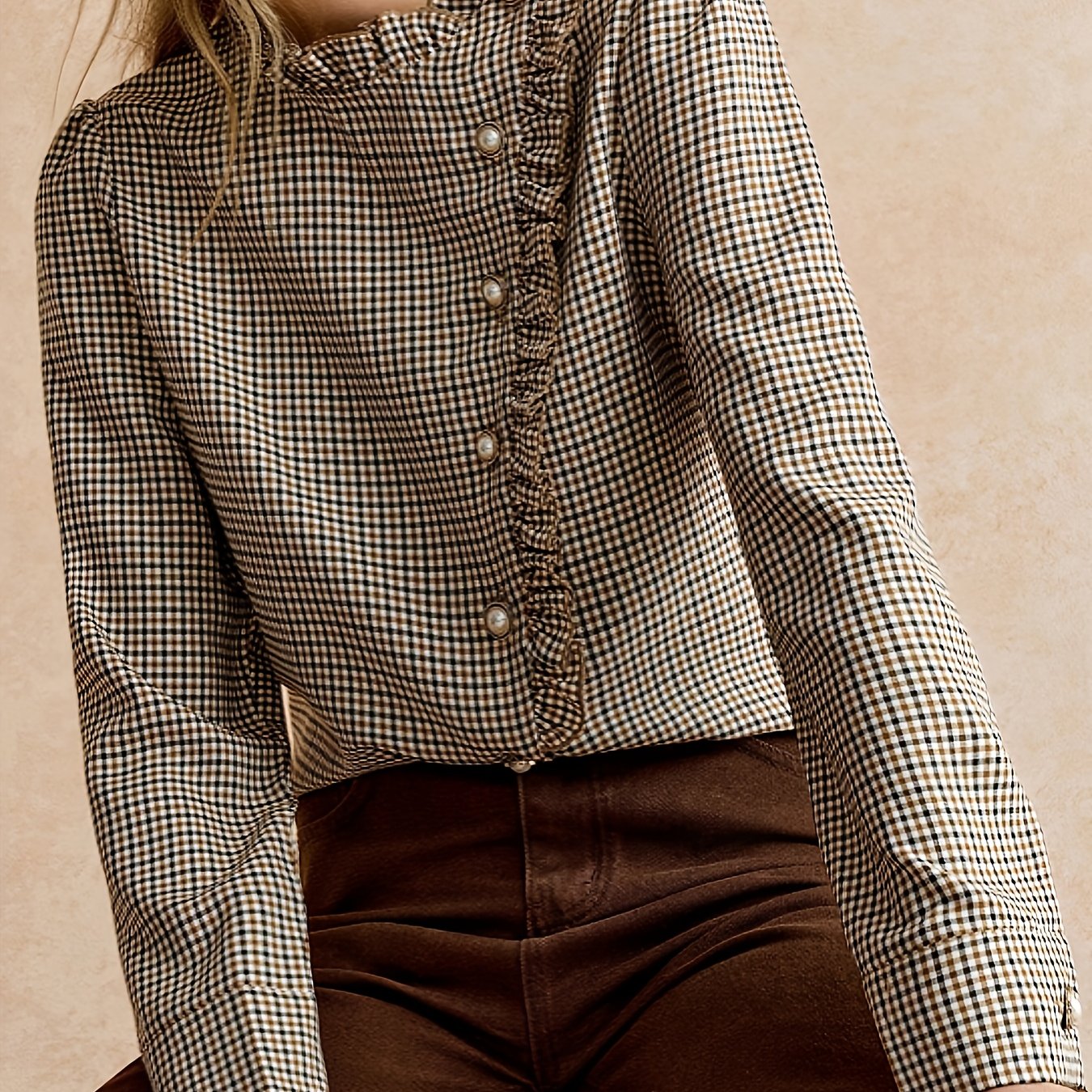 TEMU 스몰 스탠드 칼라와 사이드 오픈이 있는 체크 셔츠, 출퇴근 및 파티에 완벽