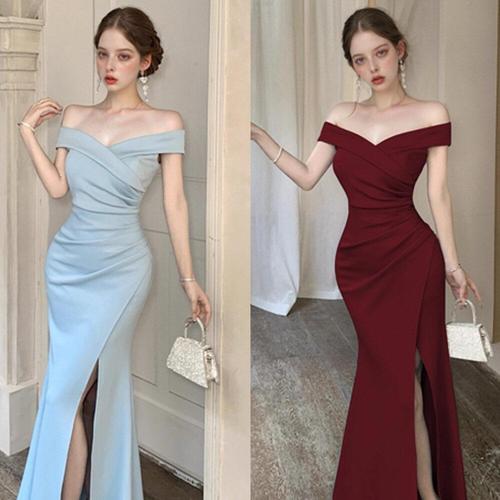 [르뚜앙]누룽지 봄 가을 셀프웨딩 오프숄더원피스 결혼식 2부 피로연 이브닝 연말 파티 연주회 블랙 롱원..