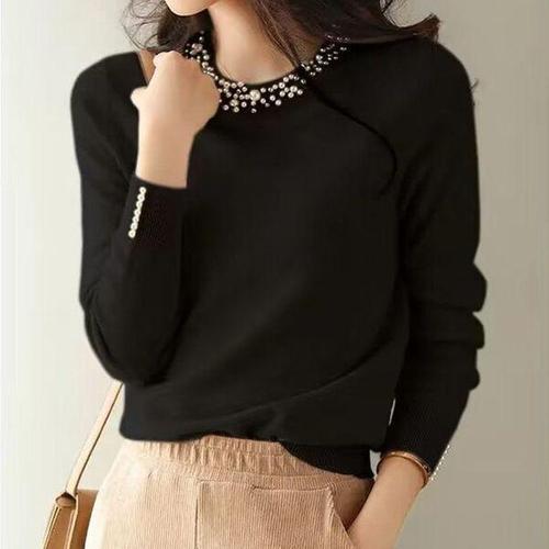 [에이치플러스몰]여성 진주 라운드 넥 긴팔 봄 가을 니트 티 블랙