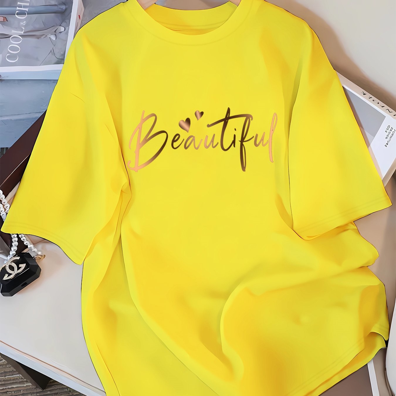 TEMU 캐주얼 파자마 스타일 반팔 라운드넥 티셔츠, 아름다운 레터링 프린트, 봄, 여름, 가을 착용에 적합한 다용도 티셔츠