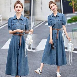 Asure 여름 얇은 데님 원피스 빅사이즈 라운드 반팔 여성 롱 원피스