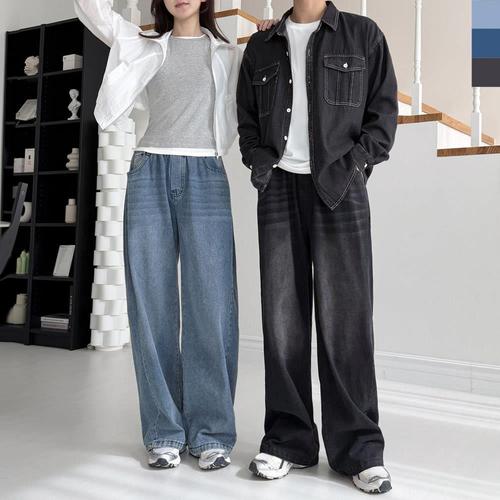 남녀공용 핀턱 스냅 버튼 와이드 데님 팬츠 밴딩 청바지 WFKQ1LH
