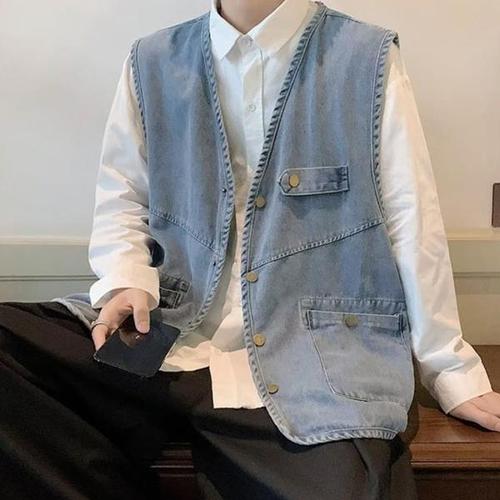 남성 봄 가을 청조끼 패션 심플 빅포켓 코트 겨울 캐주얼 데님 조끼 베스트 상의 루즈핏 데일리 민소매 아우터 WMY