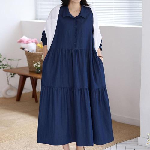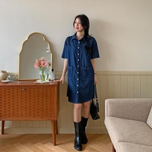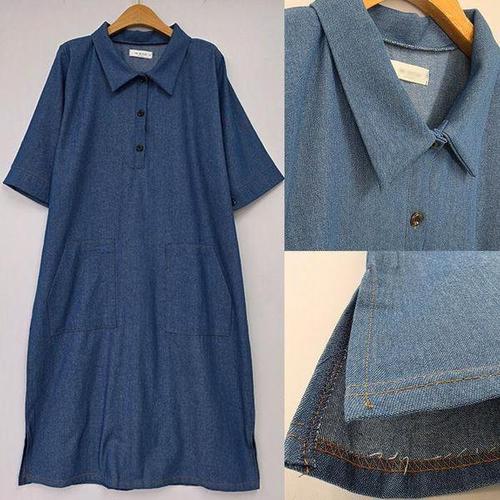 [옷자락]여자 여름 빅사이즈 빅포켓 반오픈 카라 청 롱원피스