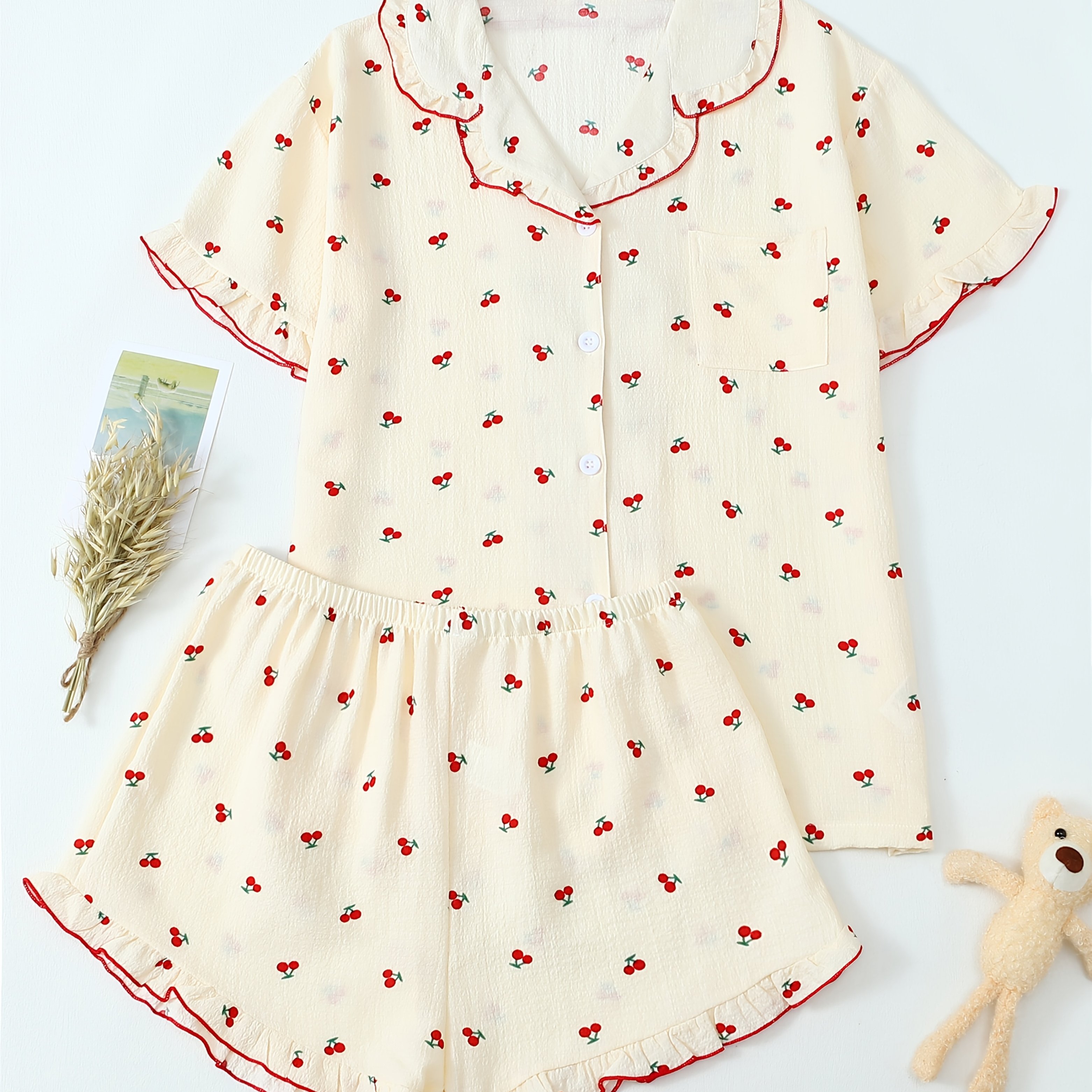 TEMU 체리 프린트 넥 반팔 숏 팬티 파자마 세트
