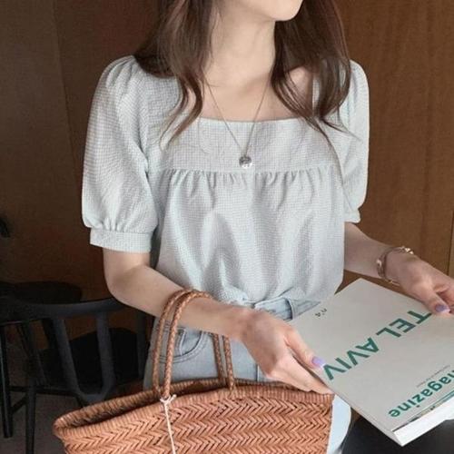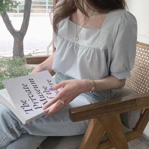 [엄지척]여자 스퀘어넥 셔링 반팔 셔츠 블라우스 퍼프 체크_19650440_667501
