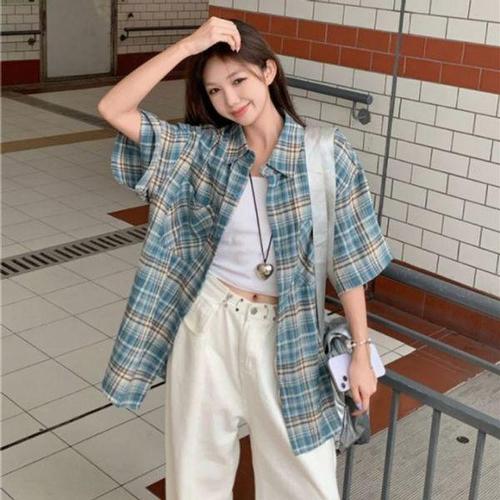 청순 체크 패턴 여자 반팔 남방 루즈핏 셔츠 2컬러 (WFKBWU2)