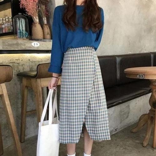 여성 봄가을 투피스 빅사이즈 언밸런스 상의+체크 스커트 세트 슬림소녀