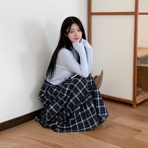 [옷자락] 여자 클래식 배색 체크 캉캉 밴딩 롱 스커트