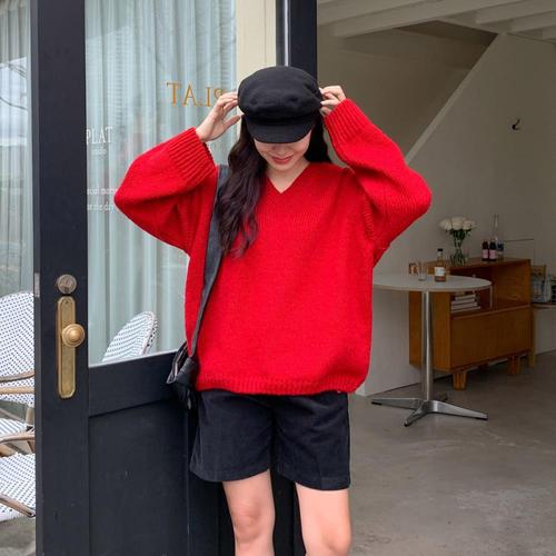 [옷자락] 여자 브이넥니트 진분홍 루즈핏 겨울 흰색 티셔츠
