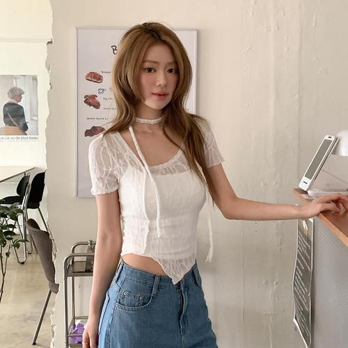 [시크블랙]시뮤어 링클 스트랩 초커 레이스 언발 반팔 티셔츠