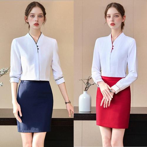 [교복몰]화이트 심플 V라인 블라우스 H라인 스커트 유니폼