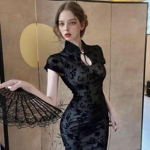 [교복몰]블랙 로즈 플로럴 패턴 차이나넥 시스루 치파오 원피